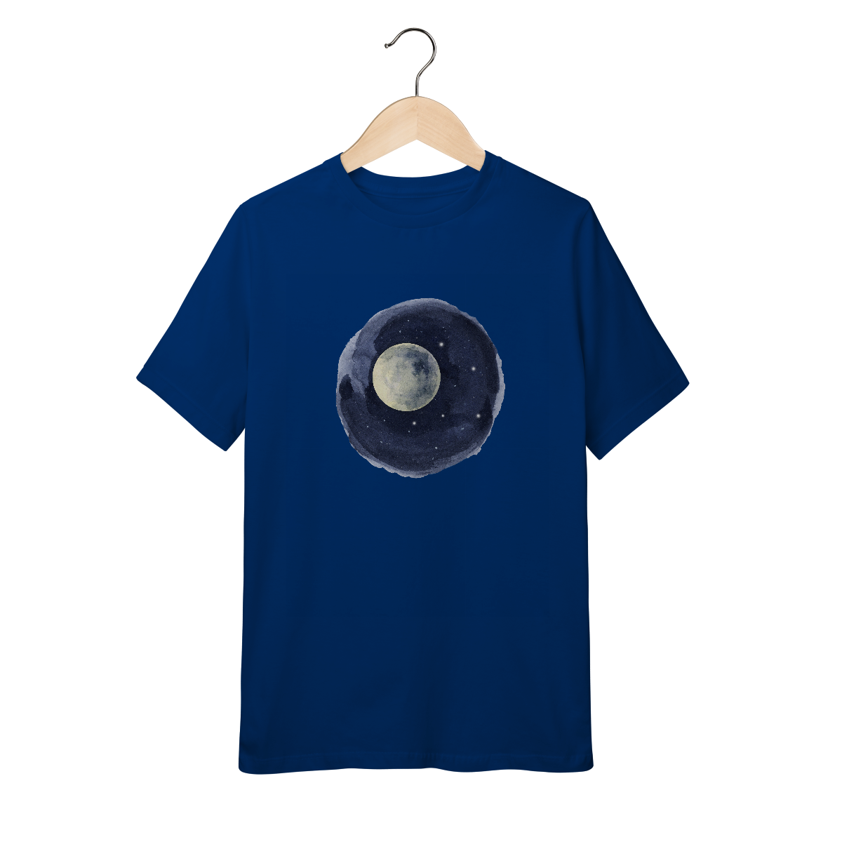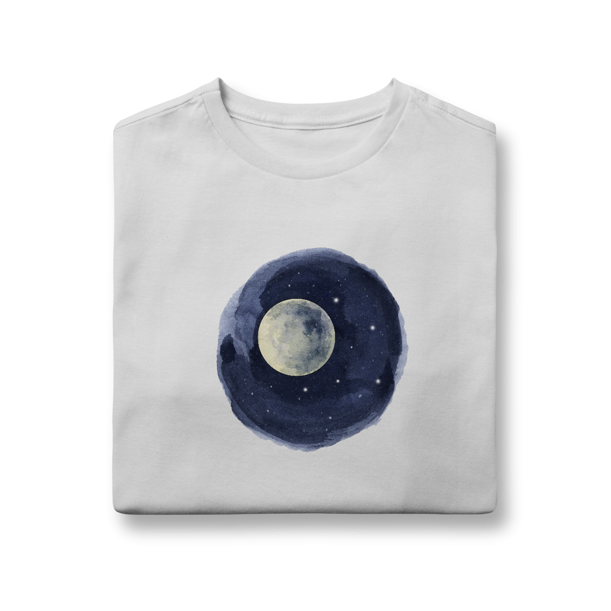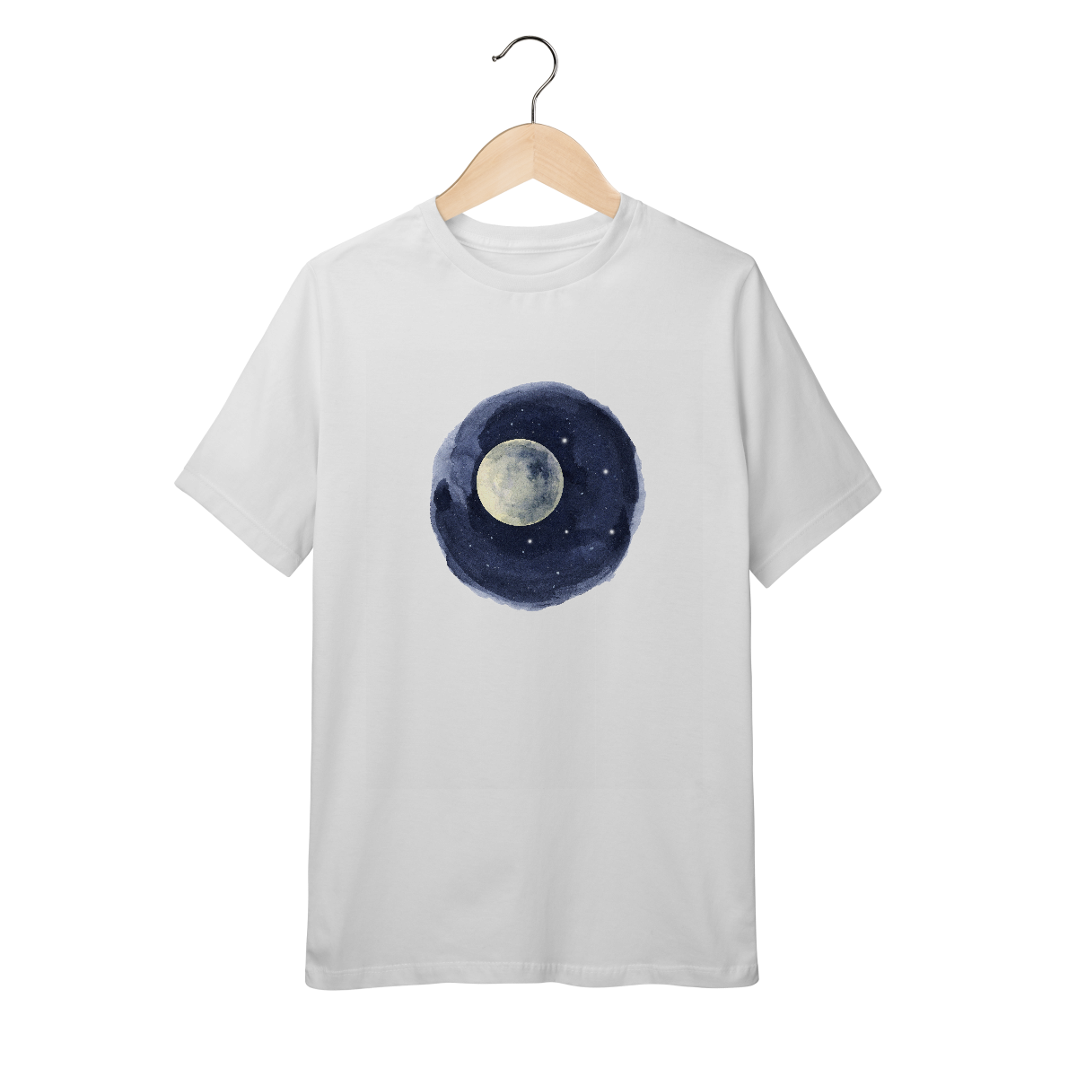 A estampa em aquarela mostra uma Lua Cheia em meio ao universo estrelado, como quem carrega no peito o brilho de quem veio pra iluminar.