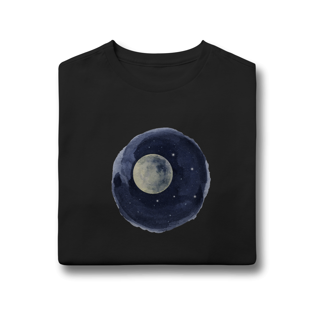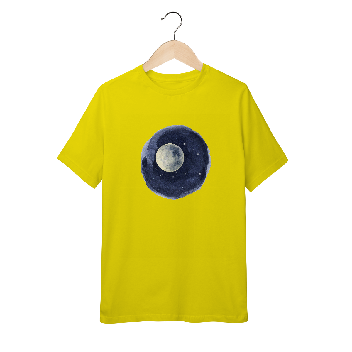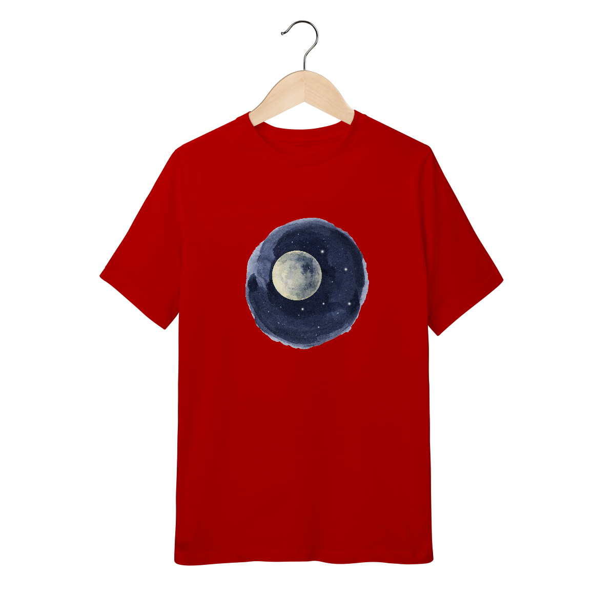 A estampa em aquarela mostra uma Lua Cheia em meio ao universo estrelado, como quem carrega no peito o brilho de quem veio pra iluminar.