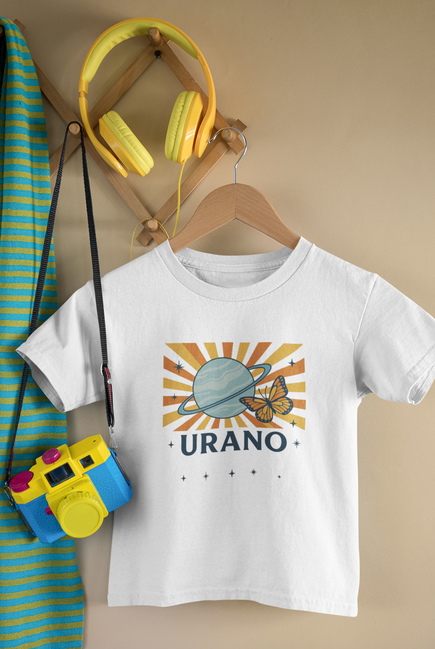 No centro, Urano, o planeta da liberdade, da intuição e da Nova Era, orbita cercado por uma borboleta vibrante — símbolo da transformação, da leveza e da beleza de ser quem se é. Ao fundo, raios solares que lembram: quem nasce luz, ilumina qualquer universo.