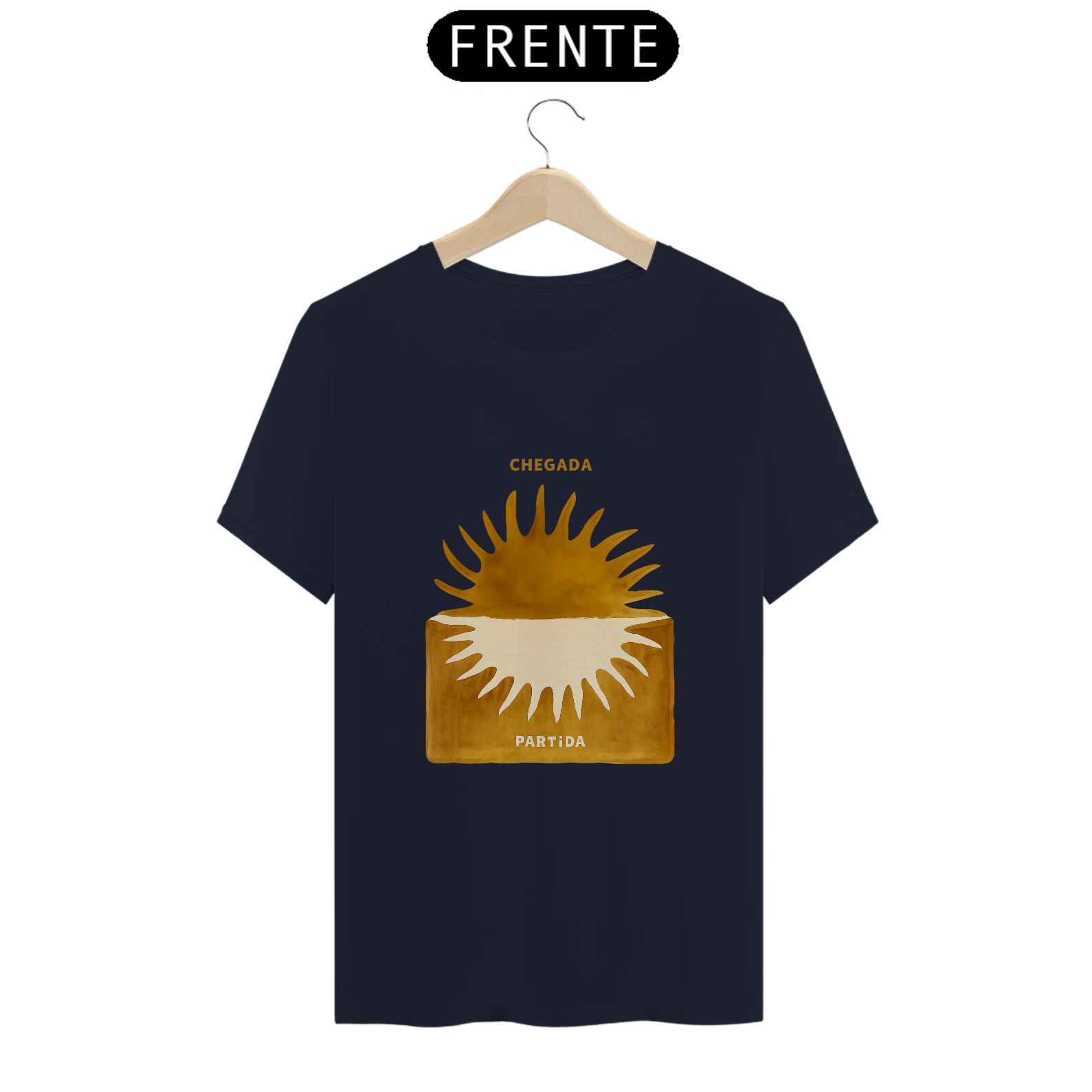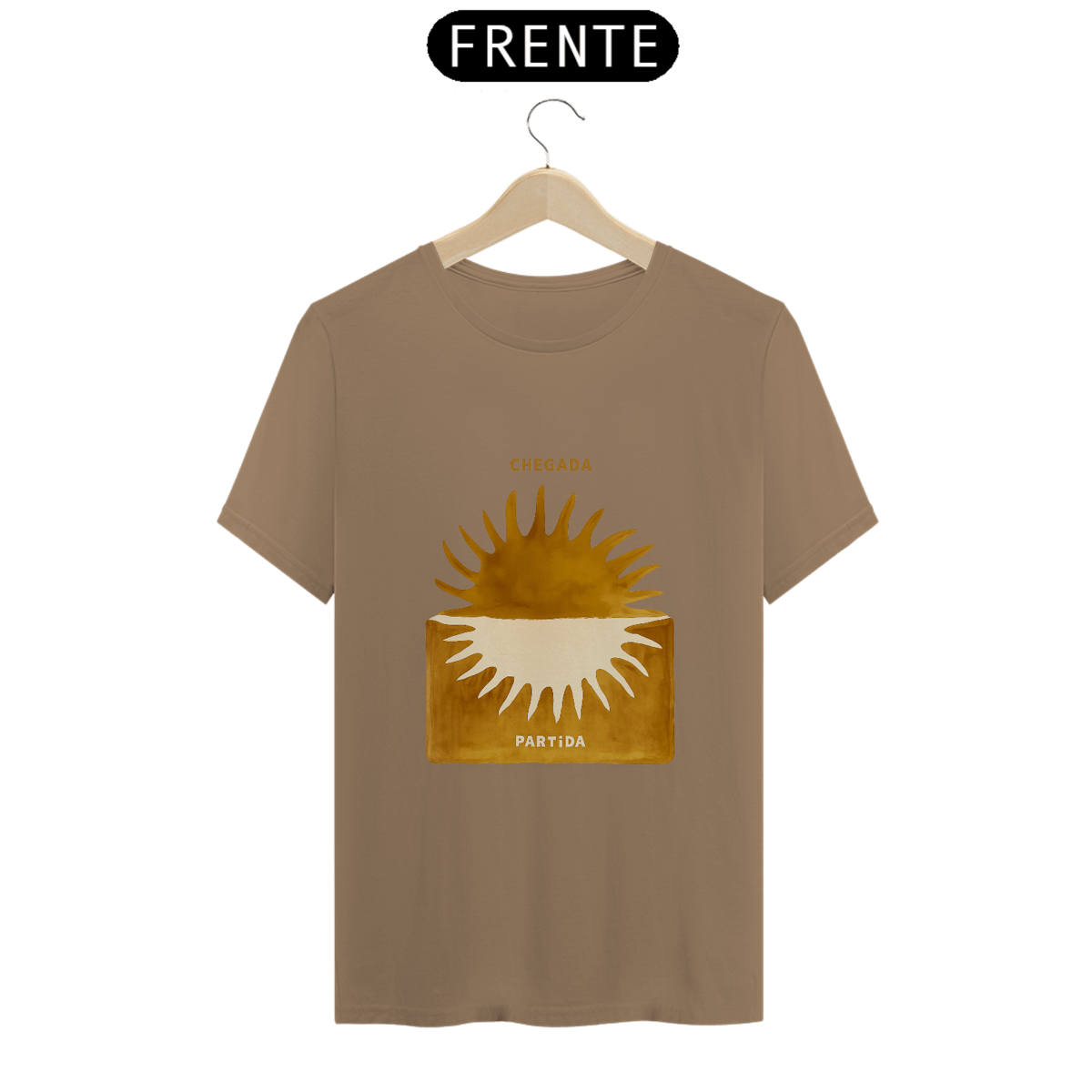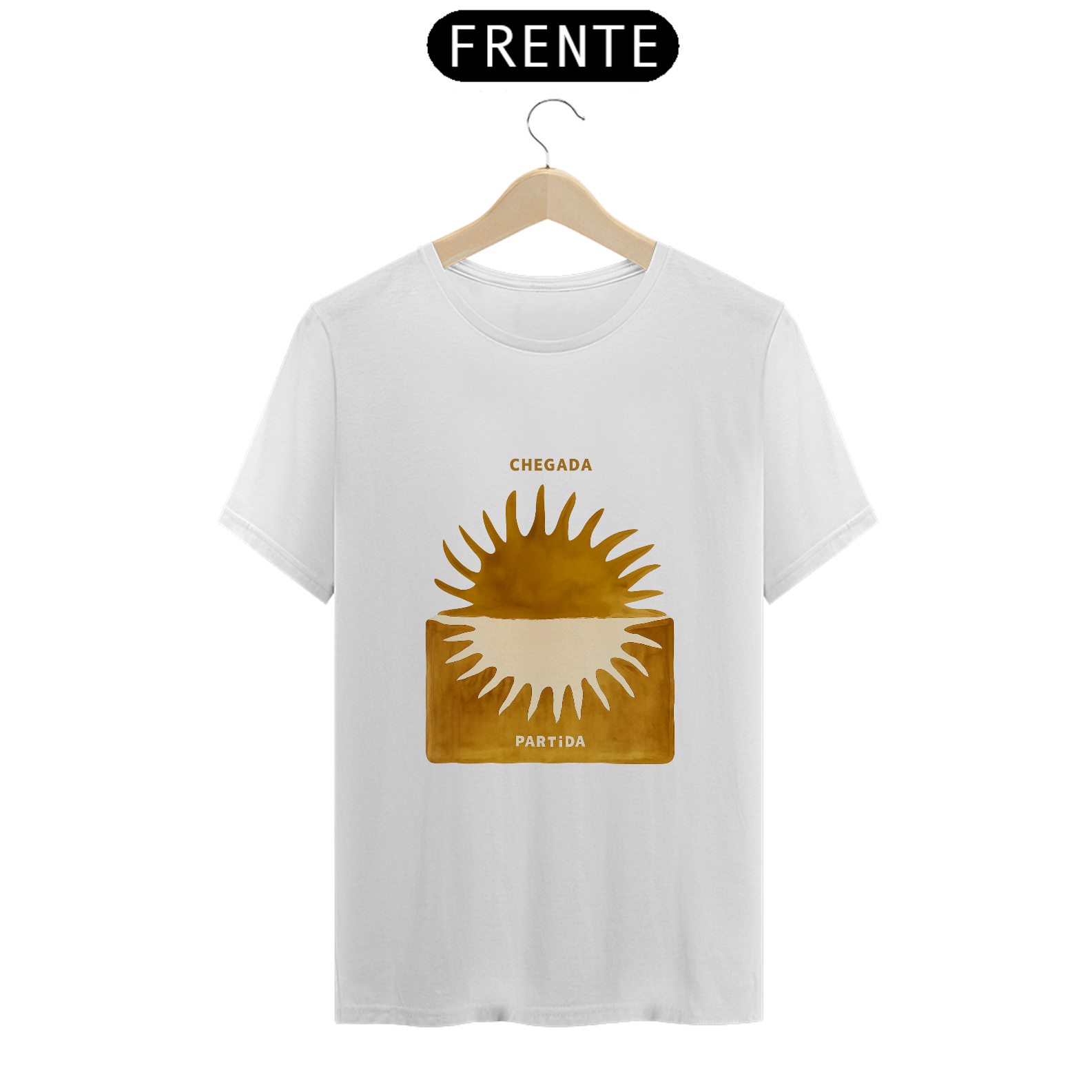 A Camiseta Chegada / Partida – Órbita traduz o instante exato em que a vida vira chave. O sol nasce por cima, se põe por dentro. Luz que chega, luz que parte. Nada se perde — tudo se transforma.
